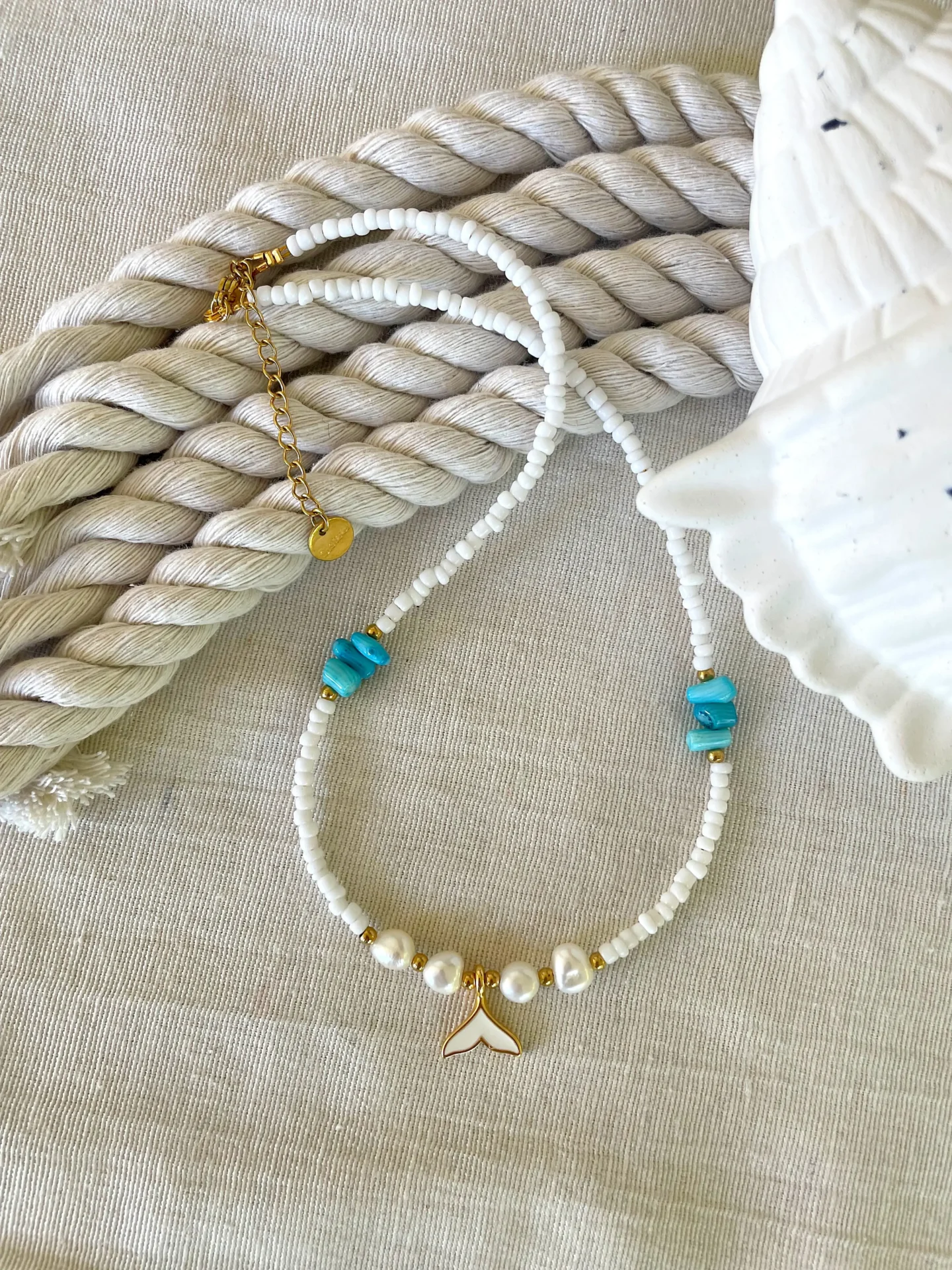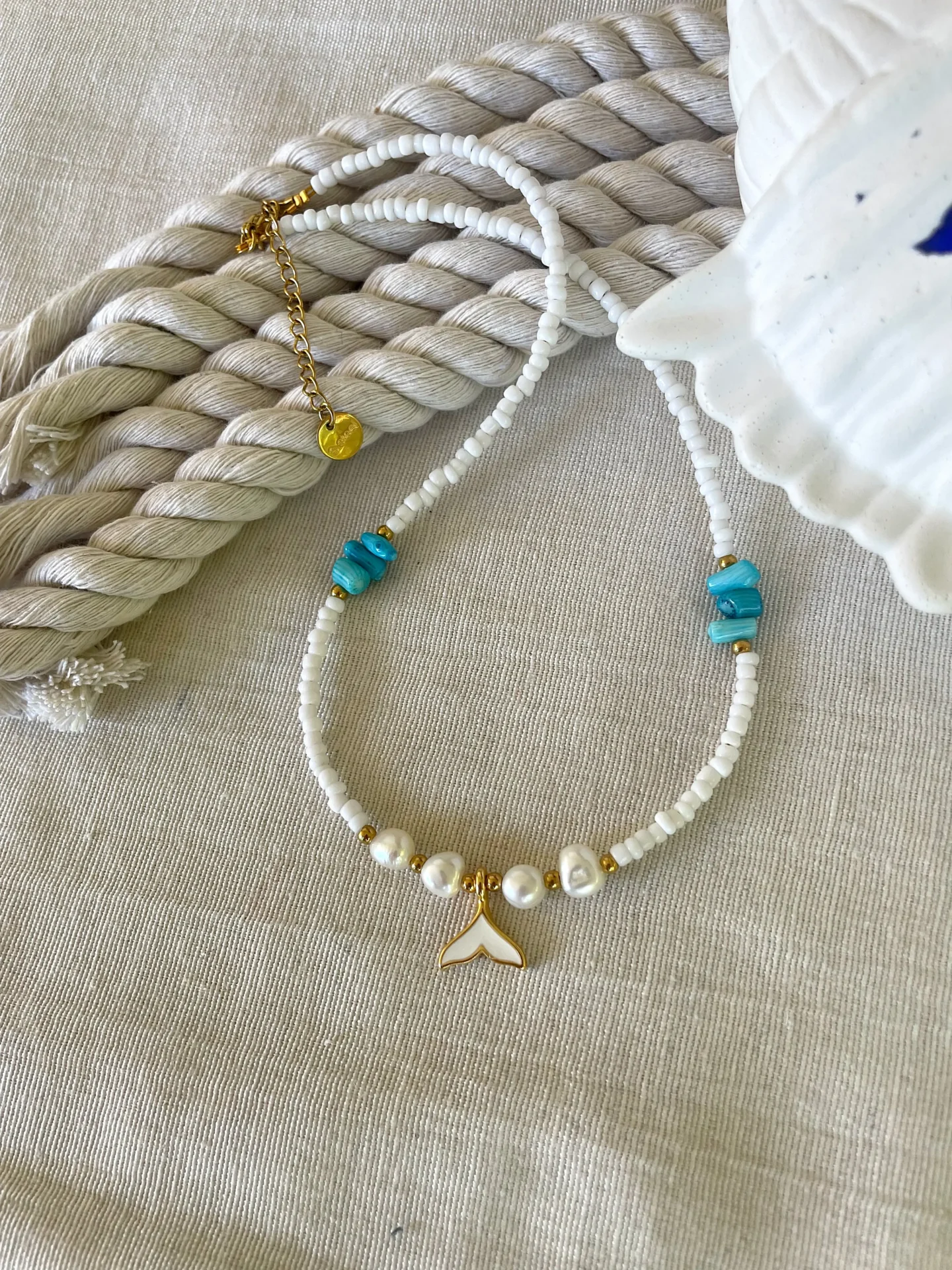 Χειροποίητο κολιέ καλοκαιρινό με χάντρες, μαργαριτάρια γλυκού νερού, κοράλλι, κεντρικό στοιχείο ουρά φάλαινας επιχρυσωμένο.