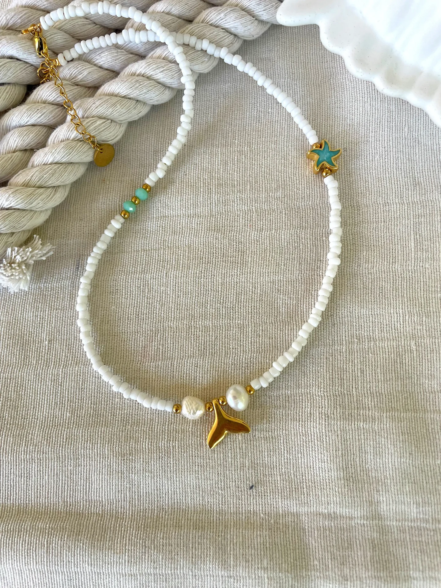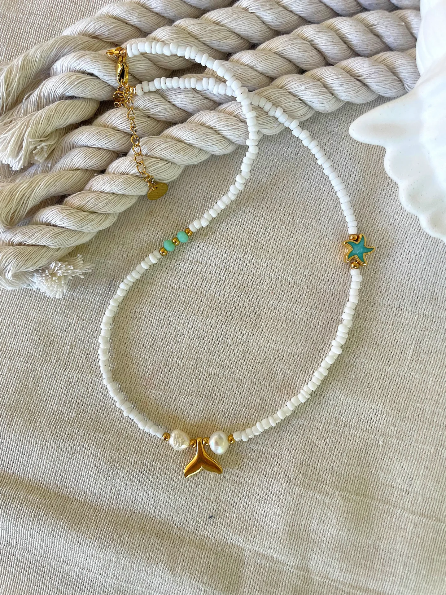 Χειροποίητο κολιέ καλοκαιρινό με χάντρες, μαργαριτάρια γλυκού νερού, κεντρικό στοιχείο ουρά φάλαινας επιχρυσωμένο.