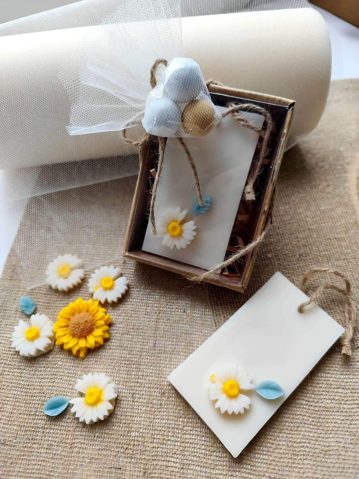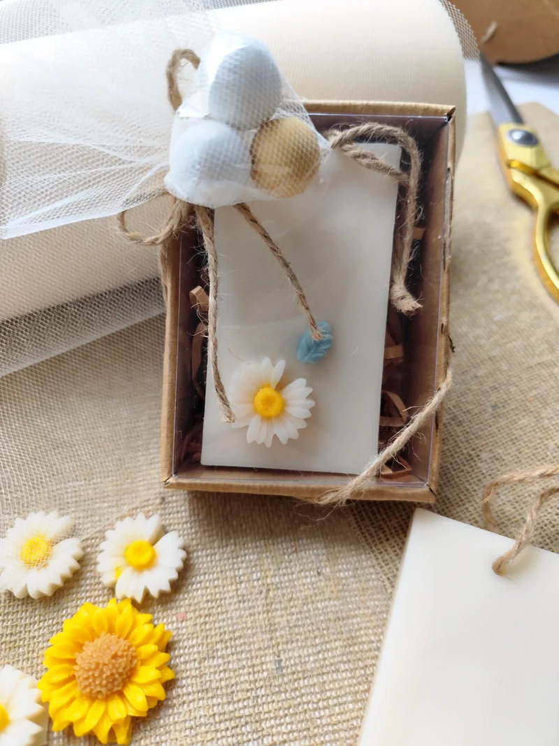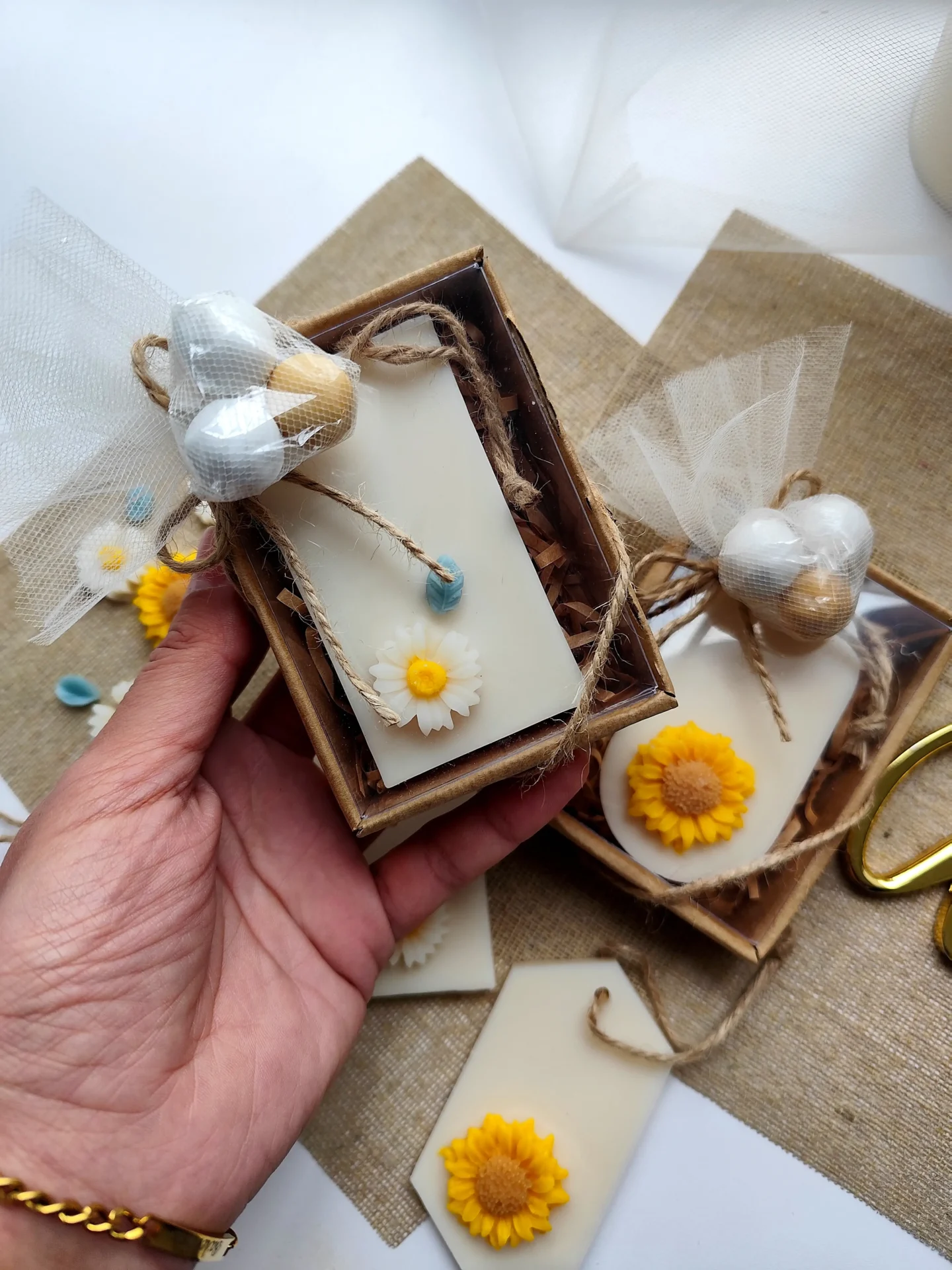 Μπομπονιέρα μαργαρίτα αρωματική ταμπλέτα ντουλάπας σε craft κουτί με διάφανο καπάκι