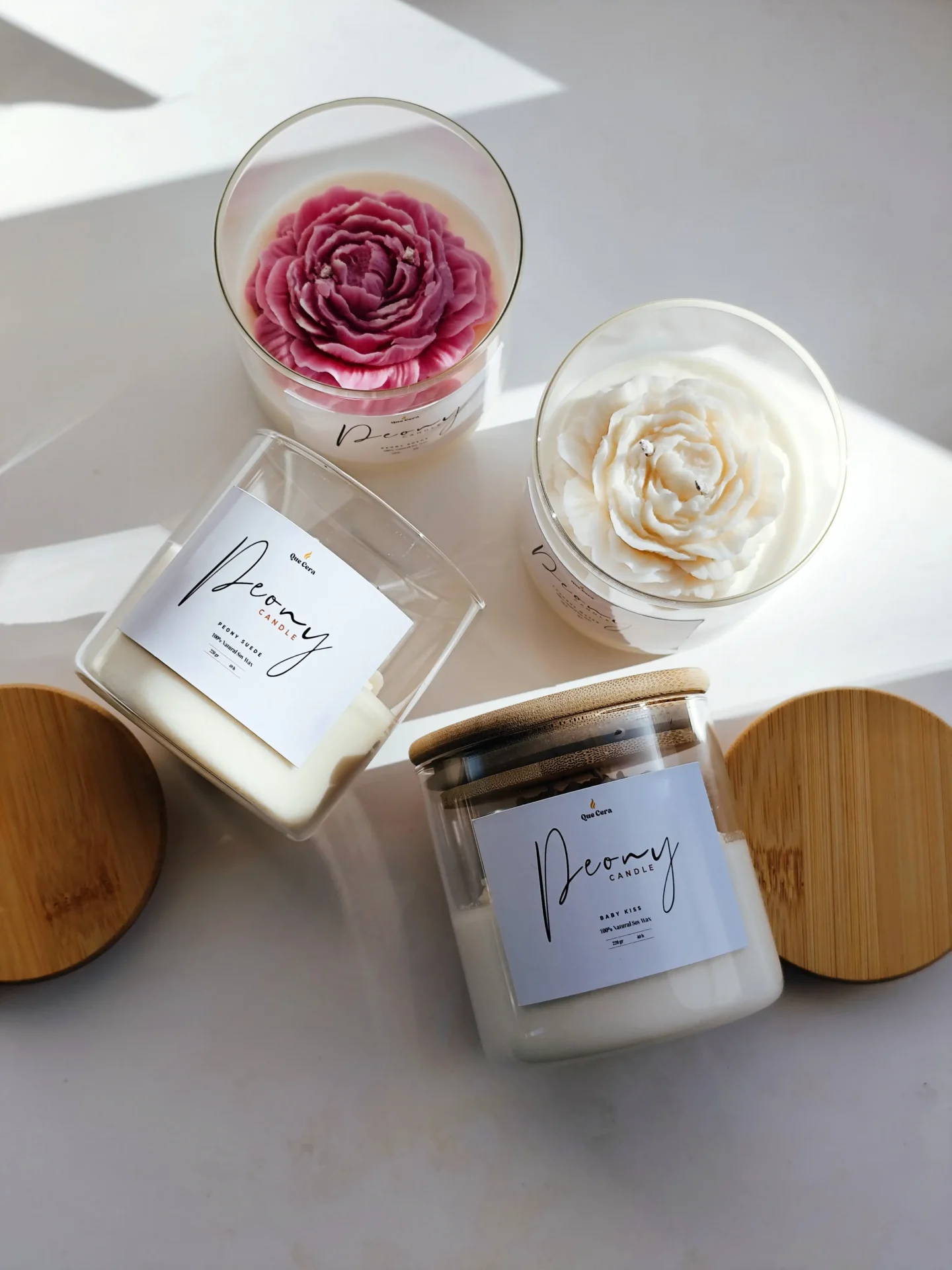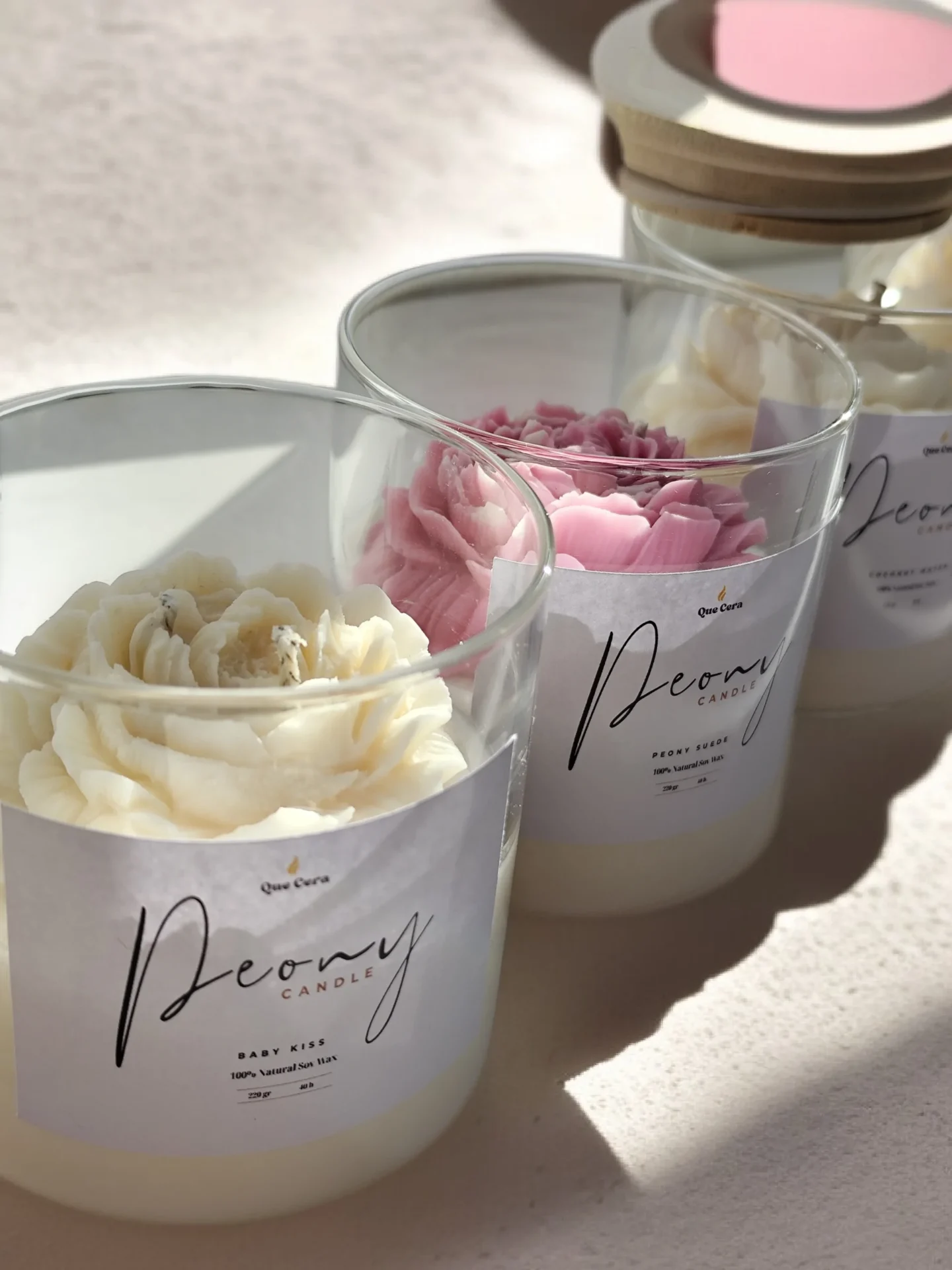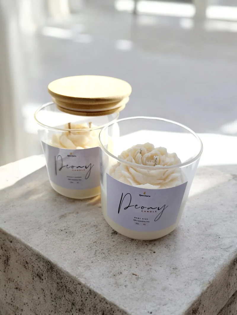 Χειροποίητο αρωματικό κερί από 100% φυσικό κερί σόγιας, σε κομψό γυάλινο ποτήρι με ξύλινο καπάκι. Διακοσμημένο με ανάγλυφο κερί σε σχήμα παιώνιας, προσφέρει μια minimal και ταυτόχρονα elegant αισθητική, ιδανική για κάθε χώρο.