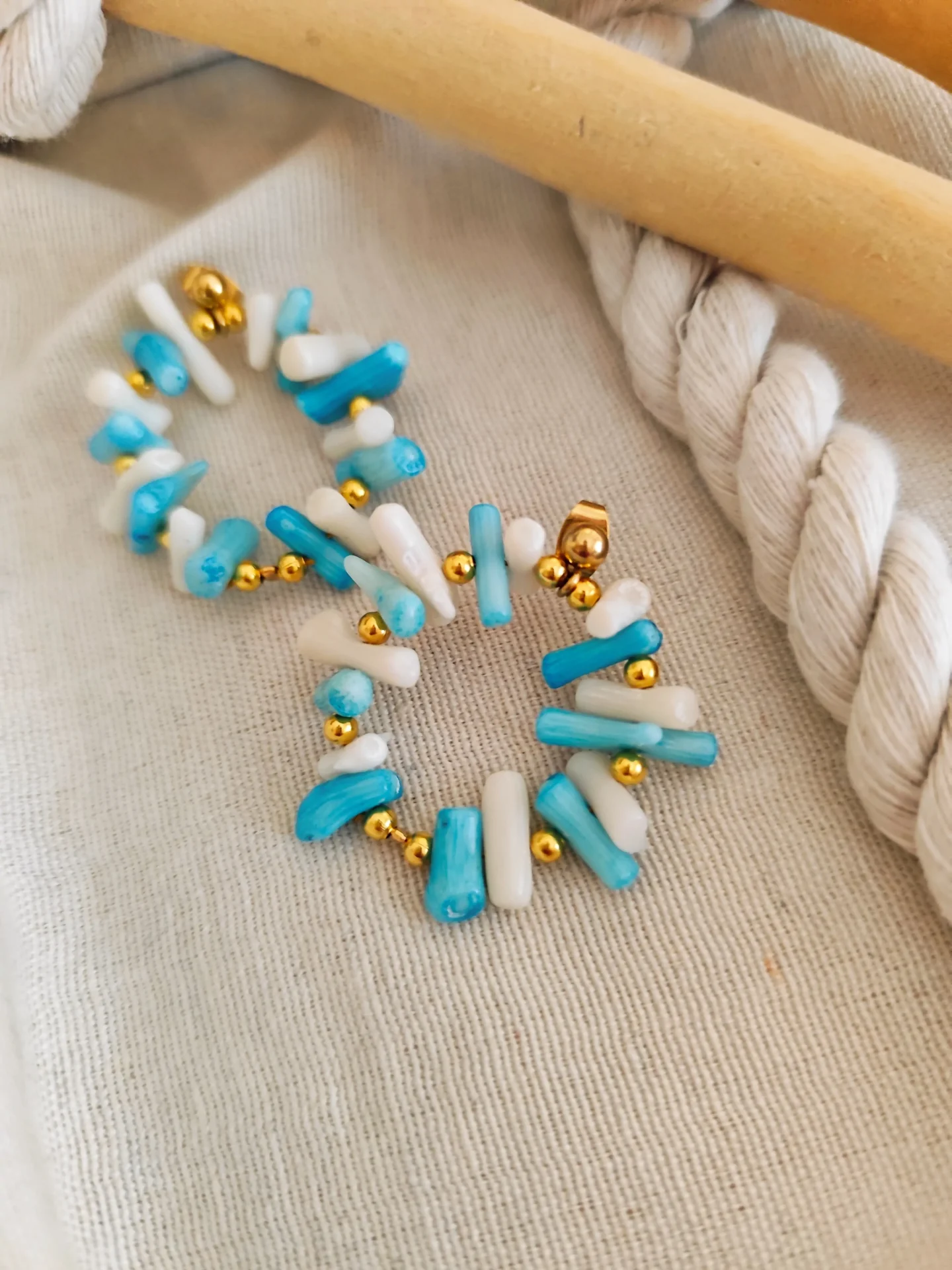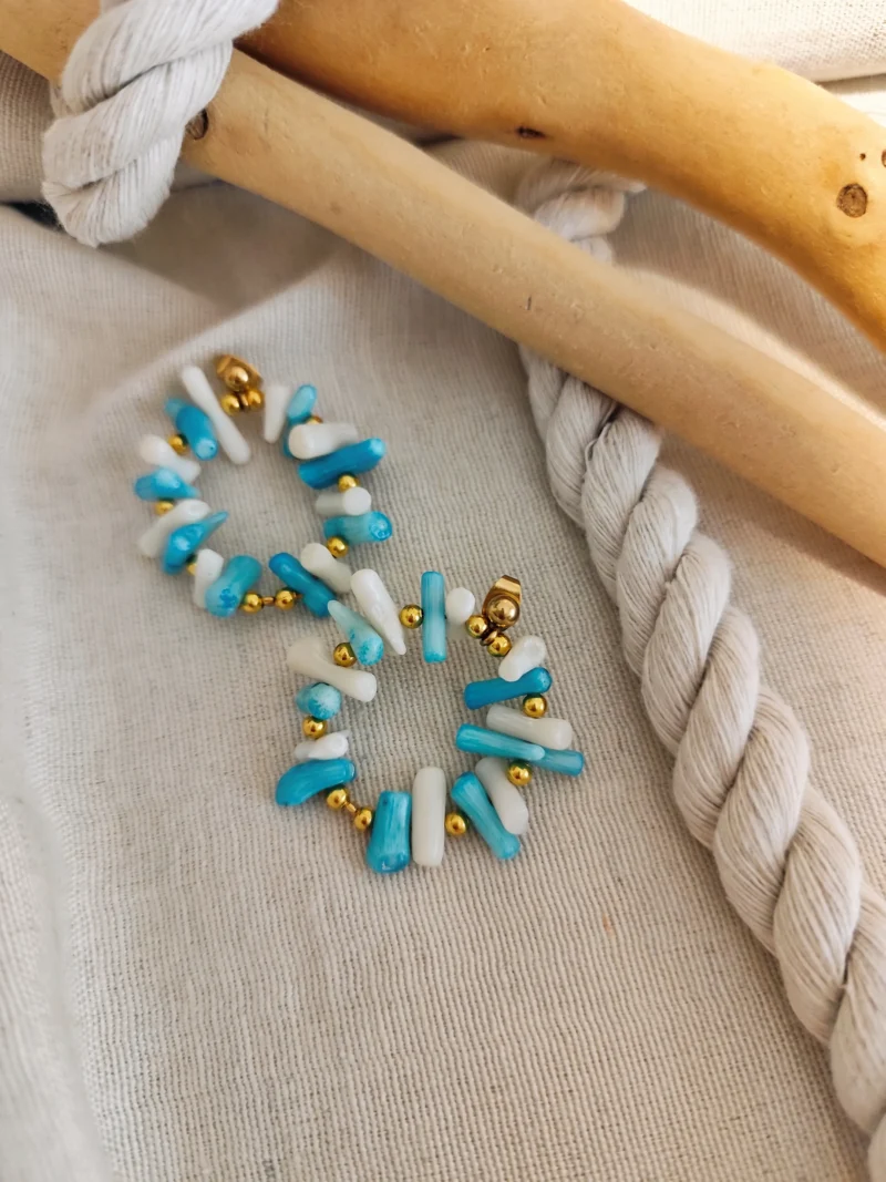 Ανανεώστε το καλοκαιρινό σας στυλ με αυτά τα κομψά, χειροποίητα σκουλαρίκια με κοράλλι σε αποχρώσεις του λευκού και του γαλάζιου. Εμπνευσμένα από τη θάλασσα και το αιγαιοπελαγίτικο φως, τα σκουλαρίκια αυτά αποπνέουν δροσιά, φρεσκάδα και φυσική κομψότητα.