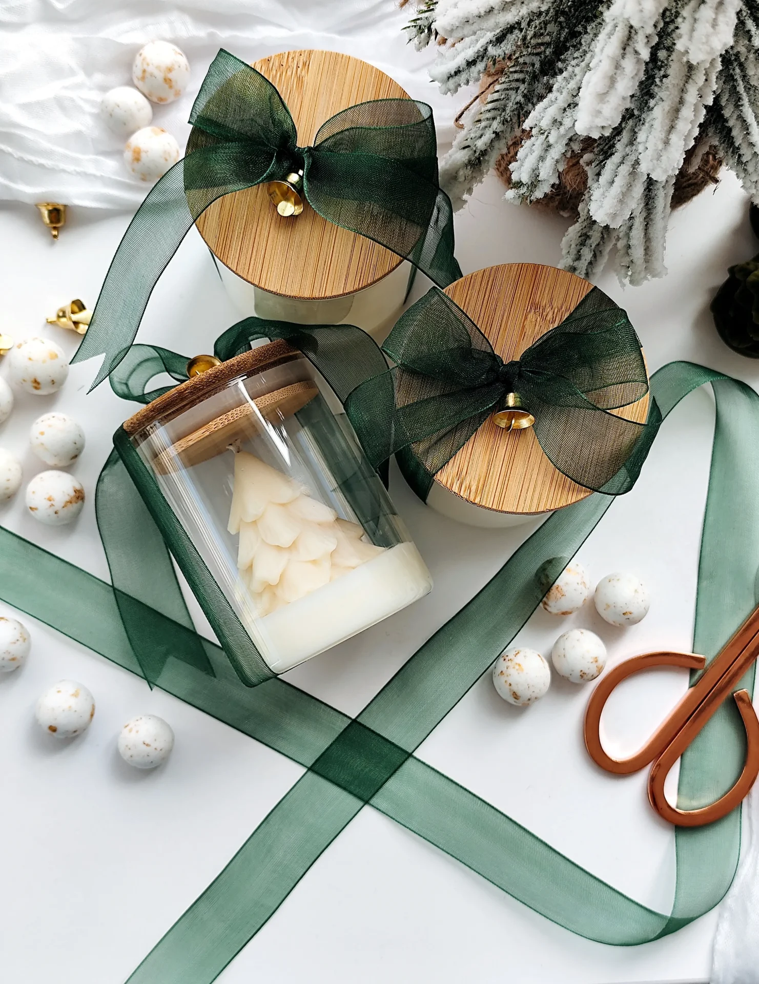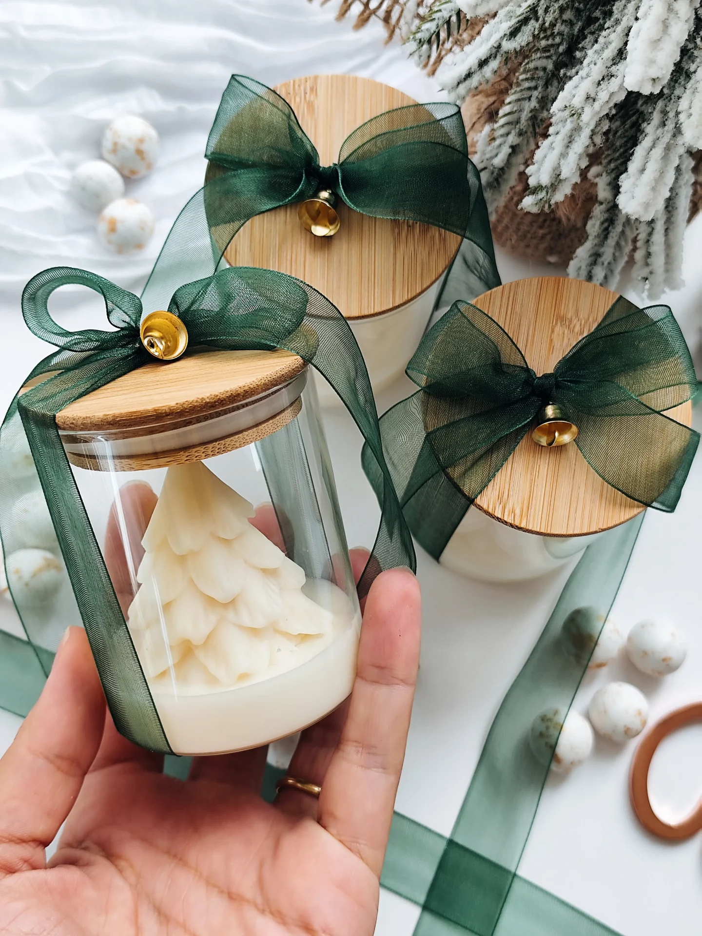 Φέρτε τη μαγεία των γιορτών στον χώρο σας με αυτό το χειροποίητο αρωματικό κερί σόγιας. Τοποθετημένο σε κομψό γυάλινο δοχείο και διακοσμημένο με ανάγλυφο χριστουγεννιάτικο δέντρο από κερί, αποτελεί ιδανική επιλογή για δώρο αλλά και για εορταστική διακόσμηση. Το φυσικό ξύλινο καπάκι προσθέτει μια minimal αισθητική και βοηθά στη διατήρηση του αρώματος.
