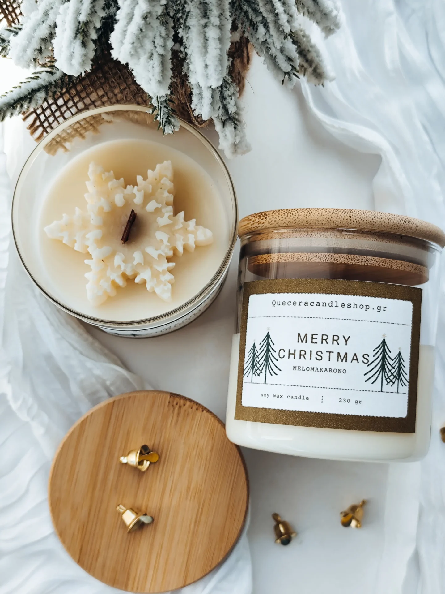 Αρωματικό κερί χιονονιφάδα σε γυάλινο δοχείο με ξύλινο καπάκι.